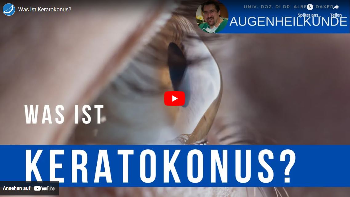 Der Keratokonus ist eine fortschreitende Erkrankung von der ca. einer von 1000 - 2000 Einwohnern betroffen ist. Am häufigsten erfolgt die Diagnosestellung bei jungen Männern (70%). Beim Keratokonus verdünnt sich die Hornhaut des Auges wegen einer Gewebsschwäche zunehmend, was zu einer irregulären Vorwölbung der Hornhaut und daraus resultierendem Sehverlust führt. Anfangs wird der Keratokonus daher oft mit einer Fehlsichtigkeit wie Kurzsichtigkeit verwechselt. Wenn aber die Sehschärfe stetig abnimmt und auch mit Brille nicht mehr korrigiert werden kann , wird die Diagnose Keratokonus wahrscheinlich. Während man am Anfang der Erkrankung oft mit harten Kontaktlinsen noch eine gute Sehschärfe erreichen kann, kommt es durch die zunehmende Steilheit der Hornhaut vielfach dazu dass diese bei weiterem Fortschreiten nicht mehr toleriert werden. Früher war dann nur mehr eine Hornhauttransplantation möglich, nach der allerdings in vielen Fällen auch kein befriedigendes Ergebnis erreicht werden kann. Seit ca. 2005 gibt es mit Crosslinking eine einfach durchzuführende Behandlungsmöglichkeit die Hornhaut in einem frühen Stadium, wenn die Sehschärfe noch gut ist, durch "Versteifung" zu stabilisieren und das Fortschreiten der Erkrankung in einem hohen Prozentsatz zu verhindern.